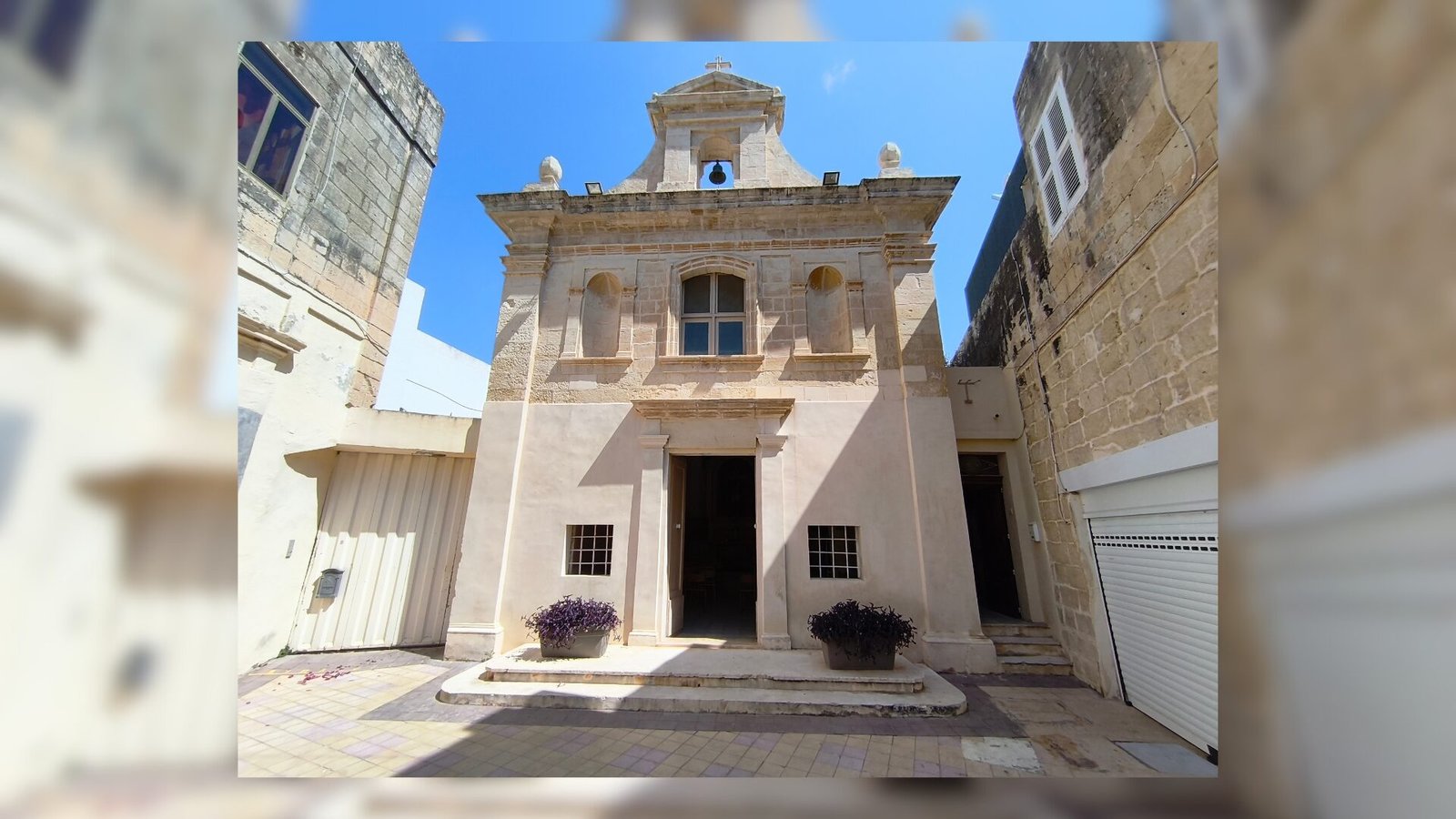Moving down the façade, the main doorway is modestly ornamented. It is framed by a pair of squared pilasters (flat, rectangular columns) on either side, which support a plain horizontal lintel and a slightly protruding cornice (ledge). This cornice acts like a small roof over the door, protecting it from rain. Above the door, instead of a grand sculpted coat-of-arms or elaborate statue (as seen in larger churches), there is just that rectangular window. However, even this window is framed by a graceful moulded border and topped with a shallow open segmental arch in stone, giving it character. The two empty niches on either side of the window are topped with similar small arches and have neat little sill ledges at their base. Though empty now, one can imagine they might have once held small statues or at least painted panels of saints. Some speculate that perhaps statues of St. Roque and St. Anne could have been placed there, but no record confirms it – if statues ever existed, they may have eroded away or been removed. Today the niches are just concave shells, but they cast lovely shadows that enliven the façade as the sun moves. The corners of the façade have simple pilaster-like edges, giving an illusion of columns that frame the whole front. Crowning the top corners of the façade are two tiny spherical finials (stone orbs) – a common decorative motif in Maltese Baroque architecture symbolizing completeness or eternity. In summary, the exterior presents a harmonious composition: central axis symmetry, minimal ornamentation, but well-balanced proportions. The creamy colour of the limestone against Malta’s blue skies makes it a photographer’s delight, especially now that it has been cleaned to its original hue.