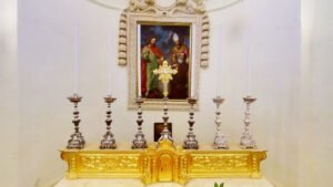 ‘Paul’ was the namesake of the Bishop of the time. The painting on the altar is by Enrico Regnaud (1692-1764) and shows Saint Paul, Saint Publius and Saint Francis of Paola.