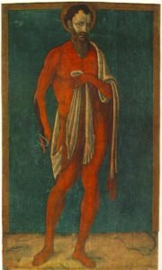 Saint Bartholomew is commonly depicted holding a knife, the instrument of his martyrdom, and in some works, his own skin. One of the most famous portrayals appears in Sistine Chapel, where Michelangelo painted him in The Last Judgement, holding his flayed skin—widely believed to bear the artist’s own face.